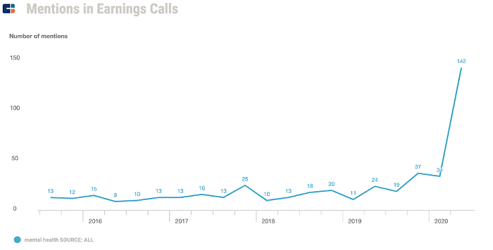 In a recent study by the U.S. Centers for Disease Control and Prevention, 1/3 of Americans reported symptoms of anxiety and depression, compared to 1/9 in Q1 of last year. SAMSHA, the National Helpline for mental health crises, has seen an 891% increase in call volume from this time last year. Employers are taking note and showing greater interest in finding solutions for their employees. As shown below, the number of earnings calls mentioning the term “mental health” skyrocketed in Q2 of this year.